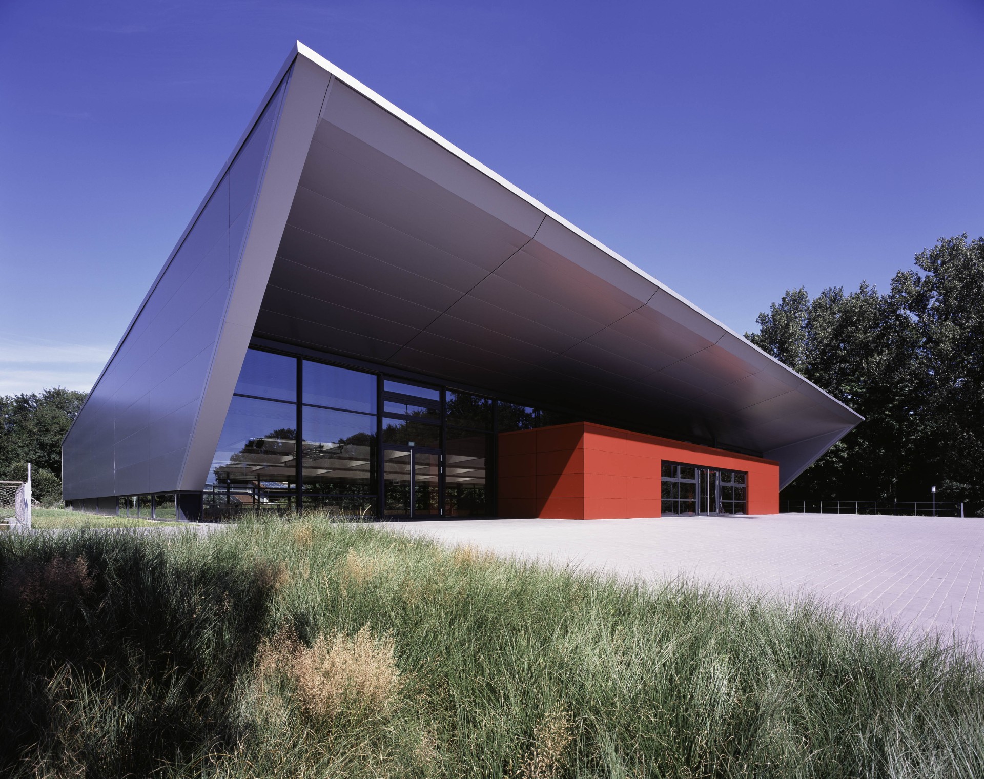 Die Besucher können direkt über einen großflächigen Parkplatz und dem Haupteingang in das Geschehen eintauchen, da der Hallenkörper zur Hälfte im Erdreich liegt. Eine großzügige Tribüne entstand auf der Längsseite. Darunter befinden sich sämtliche Umkleidebereiche und Nebenräume. Nach außen stellt sich die Sporthalle durch eine großzügige Dachgeste dynamisch dar.